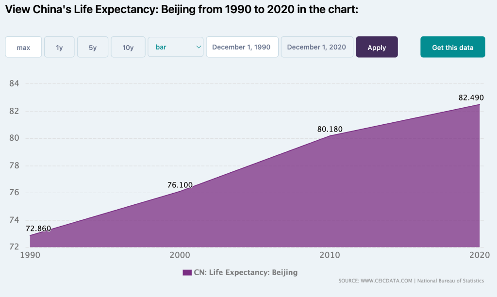 上面这两张图是来自CEIC的数据,2020年北京市的人均地区寿命是82.5岁同期中国全国是78.2岁,大概能高出四年。