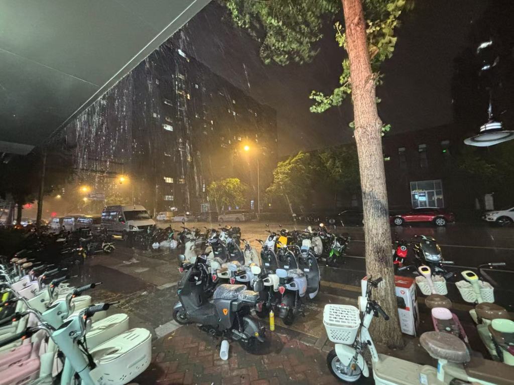 我亲眼见证,准确说是用我的皮肤亲身感受到,短短十几秒内雨量竟扩大了十几倍。雨从稀疏的点瞬间变成连续的线,我意识到自己在劫难逃,指望着跑回家必感冒,不可侥幸。转向跑到路对面,那里有一片临街的店铺,我找了一家还在开门的雅迪电动车店,准备在檐下躲雨。就这片刻,雨线又织成了致密的网,我几乎不是跑进去的,而是被这张网裹住整个甩进了屋檐下。