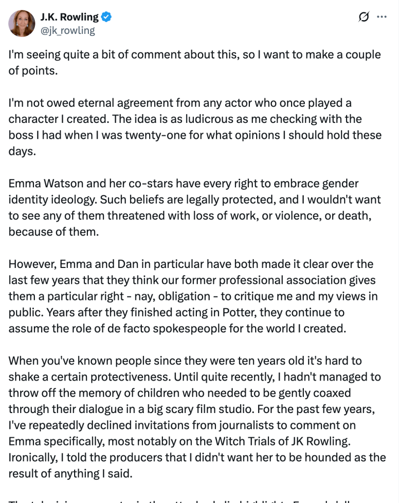 昨日晚间,JK罗琳在X上写下了她对爱玛沃特森等人的回应(原文见下方图片):