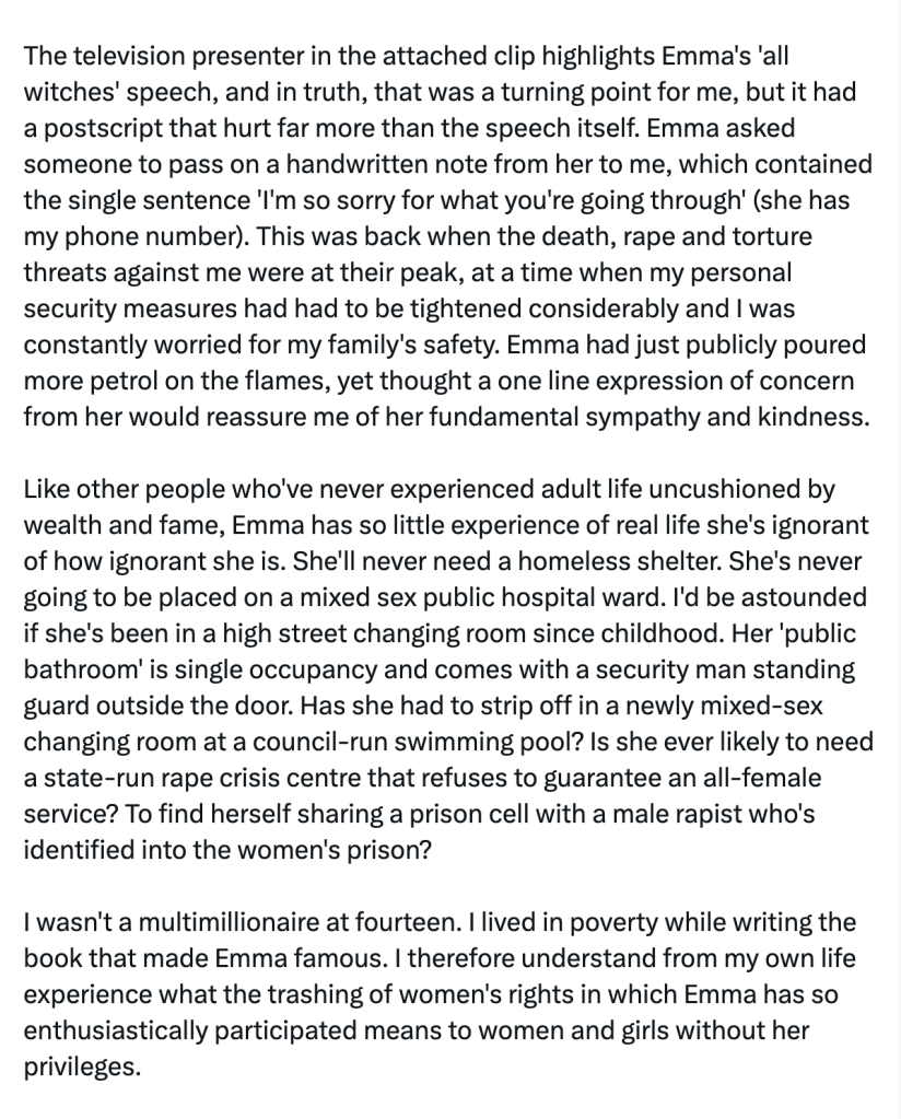 附带视频中的电视主持人强调了艾玛“所有女巫”的演讲,事实上,那对我来说是一个转折点,但它还有一个比演讲本身伤人得多的后续。艾玛请人给我转交一张她亲笔写的字条,上面只有一句话:“我为你正在经历的一切感到非常难过”(她有我的电话号码)。此事发生于针对我的死亡、强奸和酷刑威胁达到顶峰的时候,其时我的个人安保措施不得不大幅加强,我时时刻刻都在为家人的安全担忧。艾玛方才公开地火上浇油,转过来就认为她一句表达关切的话即可让我相信她对我还有基本的同情和善意。
