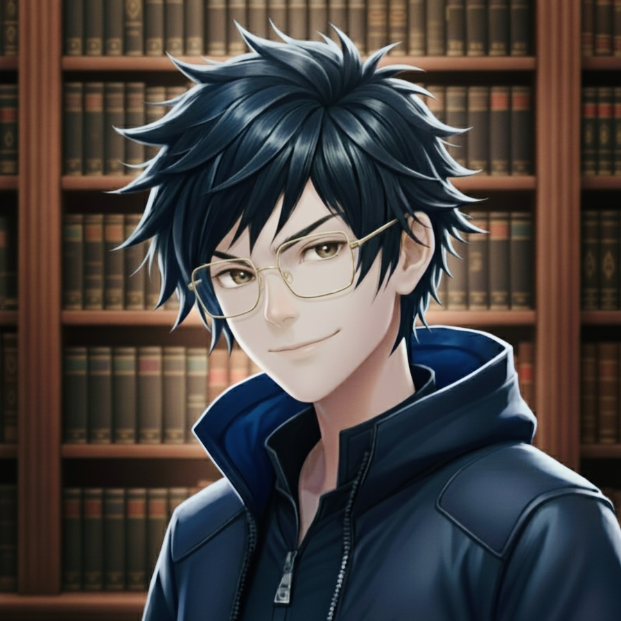 起初我脑海里只是有个大概的构思,即这张图至少要有哪些基本要素——男的,帅的,戴金眼镜,要有书,动漫风格,剩下的细节都是跟AI商量着来的,最后成了这个效果。它跟我一开始脑海中想象的图片其实已经很不一样(比如最早想的是人捧着书,现在变成了背景是书),但也以另一种形式让我满意了。