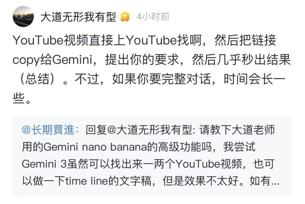 段发帖说自己看了一遍黄峥2016-2019年所有采访的文字版,然后他就跟网友说起来用AI总结视频的问题。据他说,YouTube的视频链接直接发给Gemini,提出要求,ai那边几乎秒出总结结果。