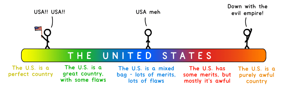 此为纵轴,另外还有横轴:那就是对同一个问题的观念光谱(spectrum)。所谓有人的地方就有左中右,人的观点总有分歧。面对同一个美国,从伟大的民主灯塔到万恶的资本主义帝国,无数ideas汇成一条从极力拥护到中立到极力反对的连续谱。针对特定问题,你持什么态度?在这个光谱上处何位置?这就是横轴。