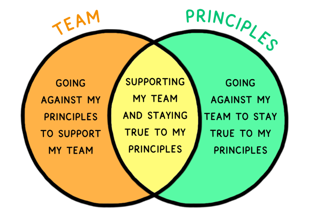 纵轴上方的人先有一些自己的原则,然后加入政治团体,身处二者交集,而二者交集越来越小的时候,他们会缩回自己的原则那个圈里面。这些原则当然就包括我们上面说的尊重事实、公共讨论等。处在纵轴下方的人,他们则是在交集变小的时候缩到左边圈里,支持自己的团体而放弃原则。