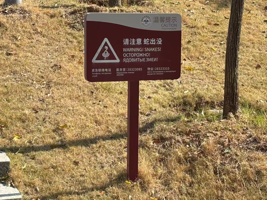 我起初难以置信,以为自己看错了。又反复看了好几遍,终于确定那上面的字我没认错,中文、英文和俄文三种语言一起明明白白地写着:请注意,蛇出没。旁边甚至还有蛇的图标。