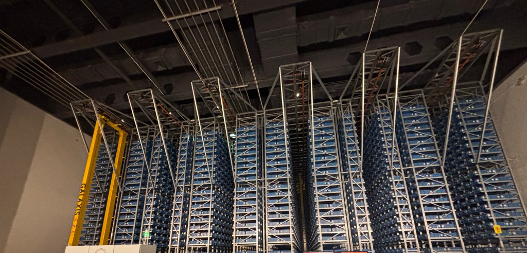 简单说,他们有一片高18米(每层6米上下3层打通)的立体空间,专门装了一套存储书籍并使用机械臂、传送带精准取出的设备。