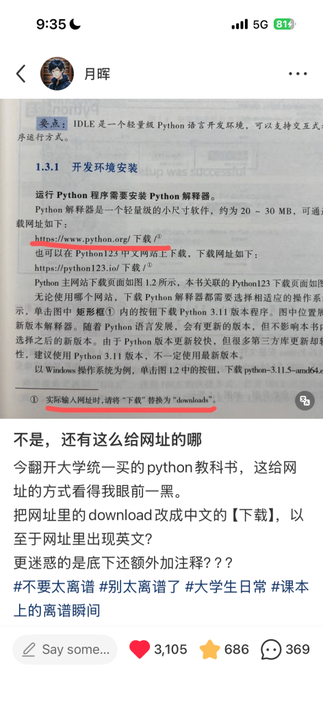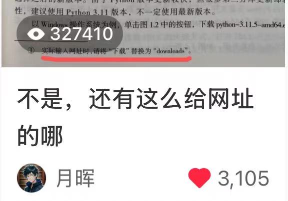 书籍编者在给python网址时,不给原本网址,而是把原网址中“download”一词用中文“下载”取代,于是本该只有英文字母、数字和特殊符号的网址里面居然出现汉字。