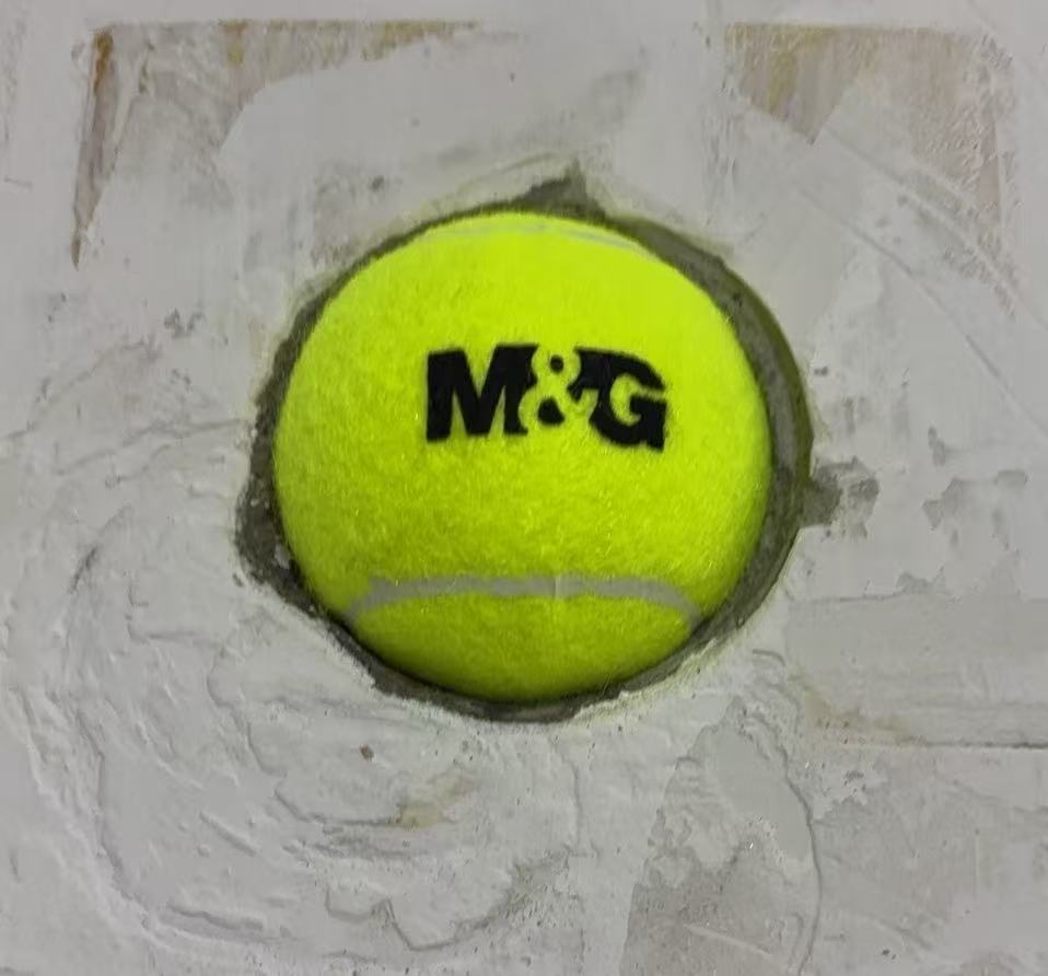 我立刻动身,去学校商店买个网球拿回来补进去。本来我以为差一点点,可能还会有缝堵不严实,需要之后再想办法,没想到非常严丝合缝,效果显著好于预期。我大喜,就这么着,以后我的卧室里将有一抹绿色,那是网球在洞口处露出的半边。